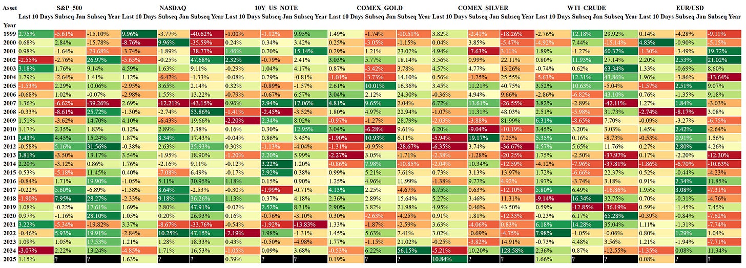 First, we pulled data for some of the assets everyone is watching, from the S&P 500 to Gold, Oil, and the Euro. The table below tracks three key performance windows for each year: