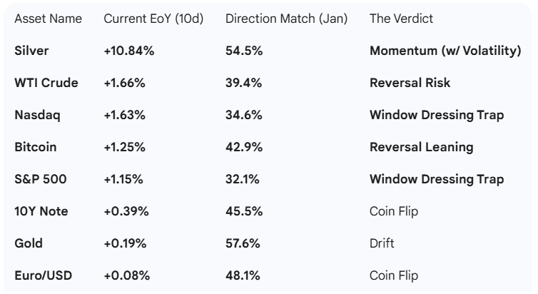 The “Window Dressing” Trap: Look at the Equities. The Nasdaq (+1.63%) and S&P 500 (+1.15%) are enjoying a nice holiday pump. But look at the history: with Direction Matches of ~32-34%, history screams that this is likely artificial buying. The probability favors a reversal, not a continuation.